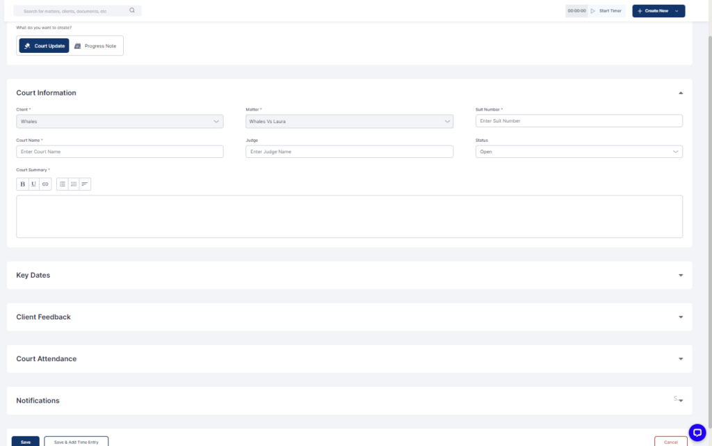• Click the matter you want to add a court update to and select Progress Update  from the horizontal tab