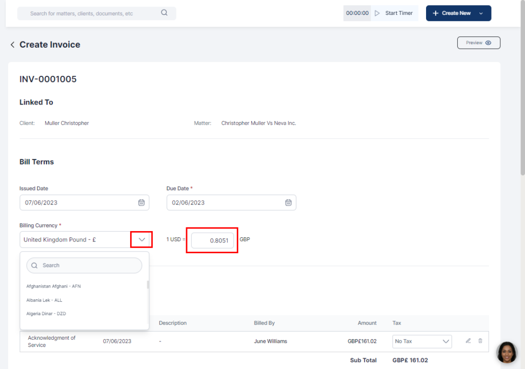 - Fill in the client details and click the dropdown on the currency box to choose your preferred currency