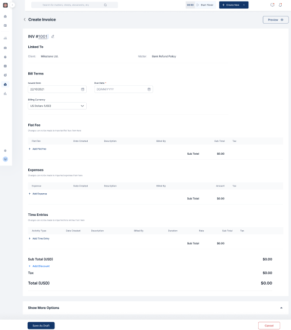 - Input bill terms, Flat fees, Expenses and time entries if relevant