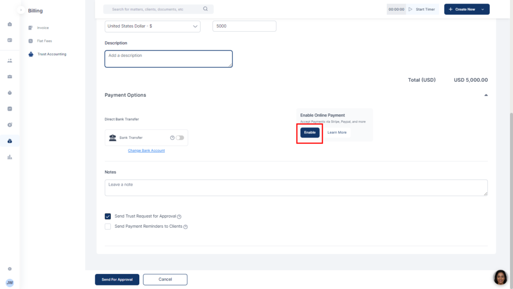 - On your trust fund request, add the online payment and click on Send Request or Save As Draft as applicable