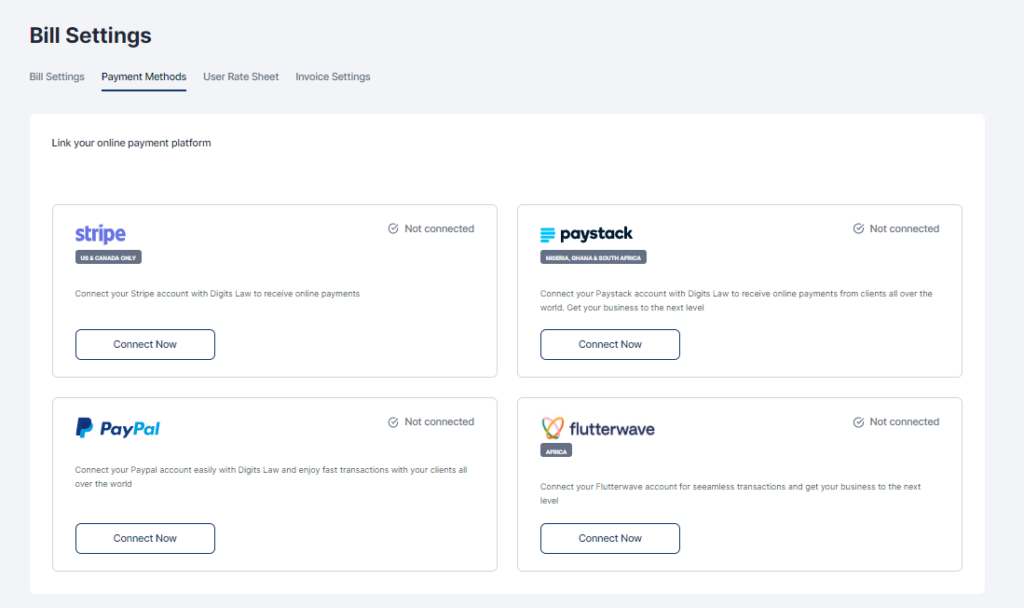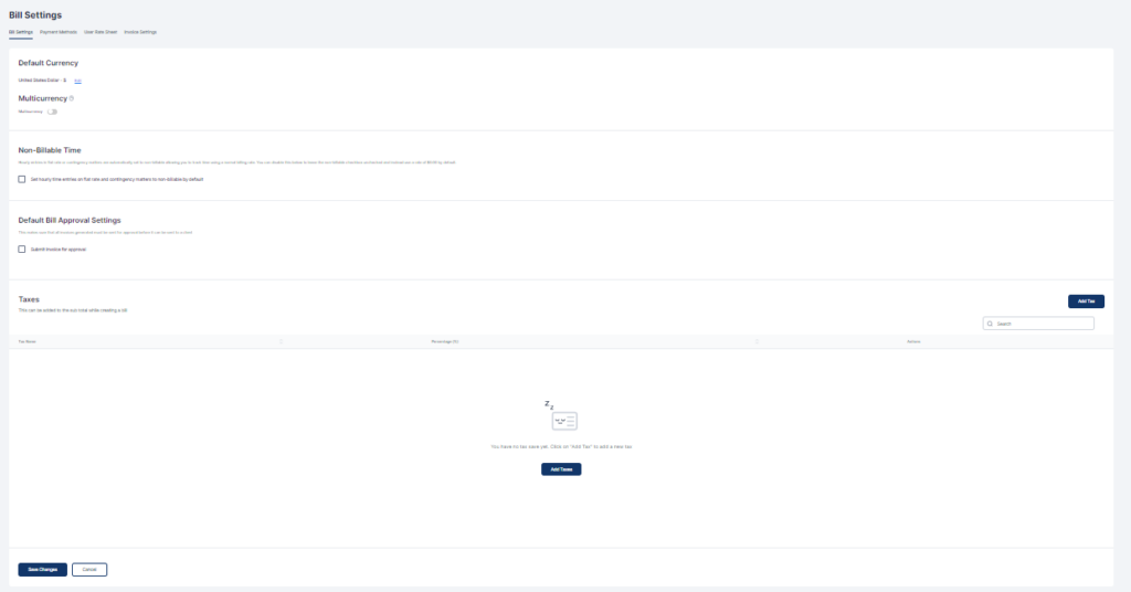 There are 4 sub-tabs under Bill settings but we advise you to complete 1, 2 & 4 when setting up your account on DigitsLaw