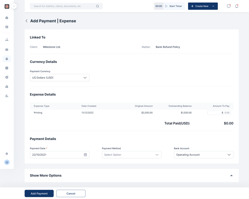 - View the expense you want to add a payment to from the expense list (client/firm).