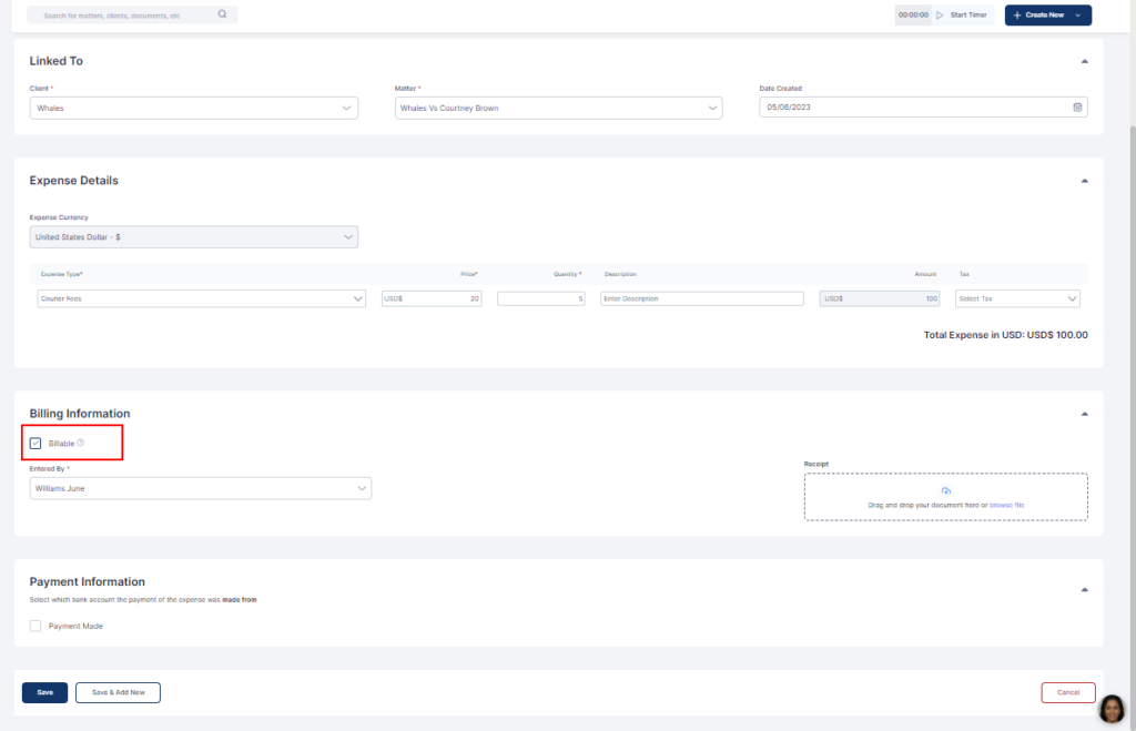 - Fill out the expense details, billing and payment information
