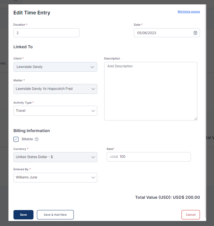 - Click on the matter whose time entry you want to edit