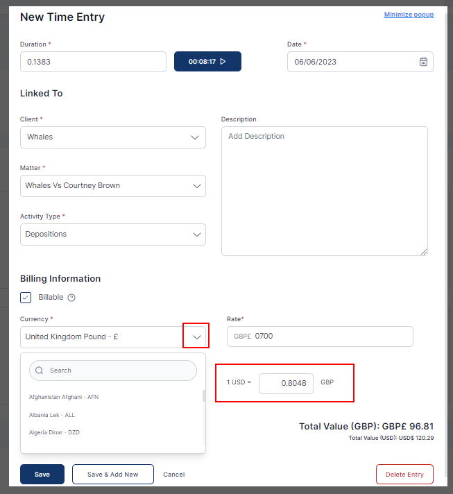 Check the Billable box while creating the entry to access the multicurrency feature. This allows you to bill or invoice clients later for this time spent later.